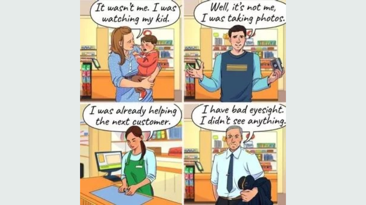 Out of the four people depicted here, only one is not telling the truth regarding their alibi. The mother with the child argues that she was "watching her kid", the man with the camera insists he was taking pictures, thus it wasn't him. While the pilot claims he "didn't see anything," the cashier maintains that she couldn't have stolen the wallet because she was "already helping the next customer."