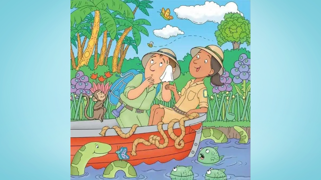Imagine yourself in a jungle setting. The scene is alive with curious animals and adventurers. A woman, who appears to be a tour guide, and a man, possibly an explorer, are the central figures. They're on a boat, surrounded by a lively array of jungle creatures. A monkey sits on the boat, a snake slithers nearby, a butterfly flutters by, and three fish swim in the water. In the middle of this bustling activity, a lollipop is cleverly concealed.