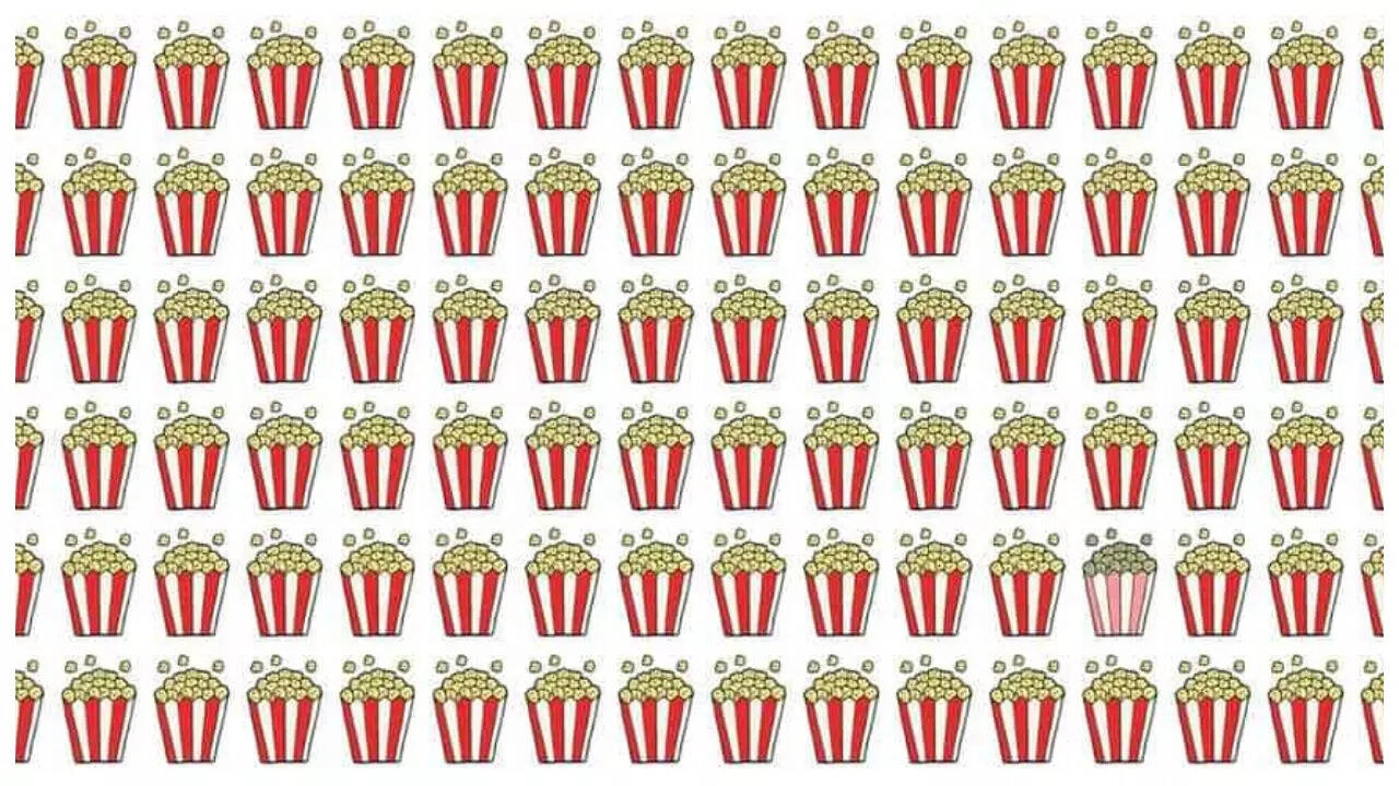 The image above depicts a grid filled with popcorn baskets. But there is a twist: one of these baskets is slightly different from the rest. Your task is to find the odd one out within just 3 seconds. Are you up for the challenge?
