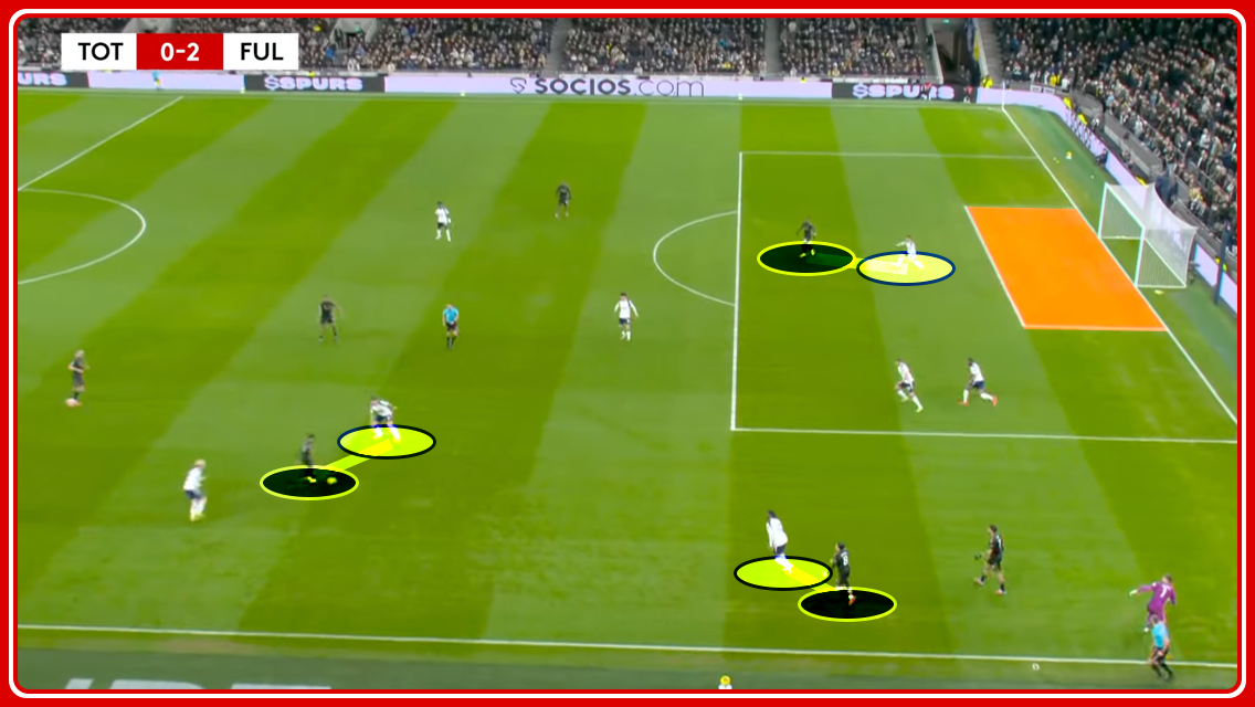 At this moment, Tottenham have lost the ball and the goal is gaping. Yet neither Palhinha nor Udogie really spring into life to deal with the situation, and both Josh King and Wilson manage to get the shot away without being directly challenged. Likewise, not two seconds prior, Pedro Porro is standing inside the six-yard box and would easily have headed away a speculative shot.