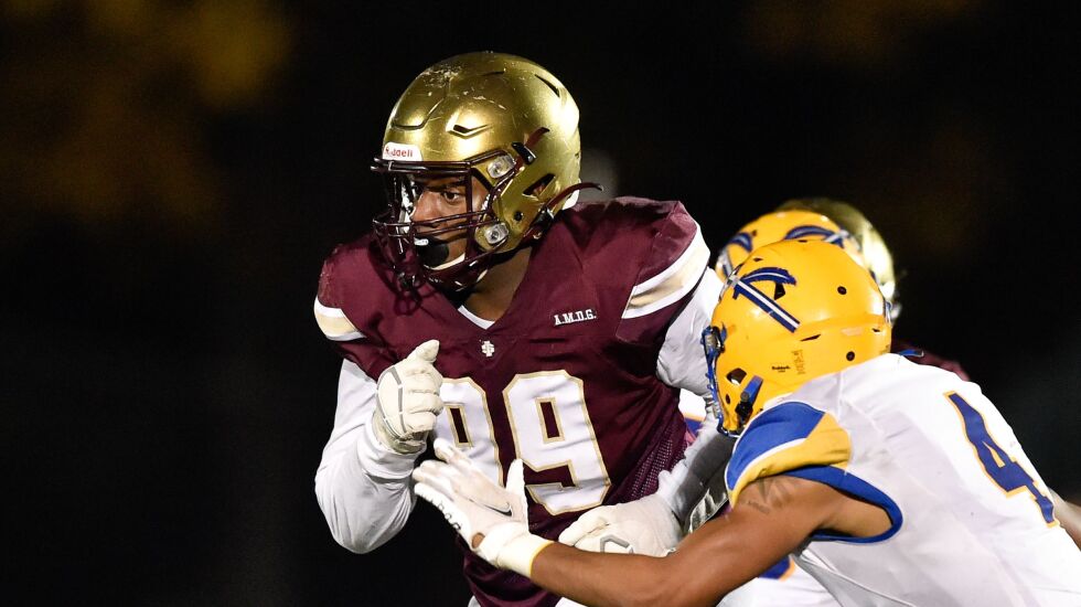 Few players have risen so far so fast. Scott didn’t come to football till he was a freshman and played just one varsity game before last season. But the 6-4, 310-pounder’s strength and athleticism quickly caught recruiters’ attention. The Ohio State commit had 42 tackles, 13 tackles for loss and 4.5 sacks last season. The No. 14 senior nationally in the 247Sports.com rankings also started at left guard for an offense that averaged 327 yards rushing and 33 points a game last season.