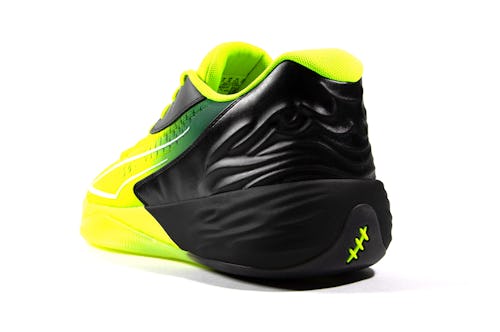 Stewart’s sneaker is certainly hard to miss. A fluorescent green shade covers the front half of the shoe before giving way to molded black heels, which boast a flame graphic that melts into the midsole like ripples of water. The design pays tribute to Stewart’s lifelong athletic journey, nodding to both her high school team and her two Achilles tendon surgeries. The latter is depicted through scar graphics at the heels, complemented by the player’s logo on the tongue and insoles.