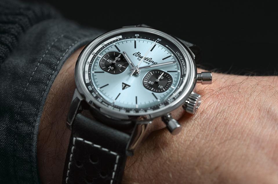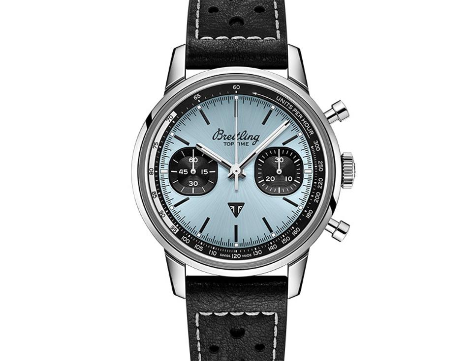 The watch was also inspired by something called cafe-racer culture. In the mid-1960s, a subculture sprang up around “cafe racers,” stylish motorcycles that were used to transport their riders from one hip cafe to another. Brand founder Willy Breitling introduced the Top Time as an homage to the culture, with an unconventional chronograph designed for young and active professionals. The unique color of the new model’s dial has two references: a blue Triumph Thunderbird 6T from 1951 and a rare, blue-dialed Breitling Top Time, Ref. 815, from the 1970s.