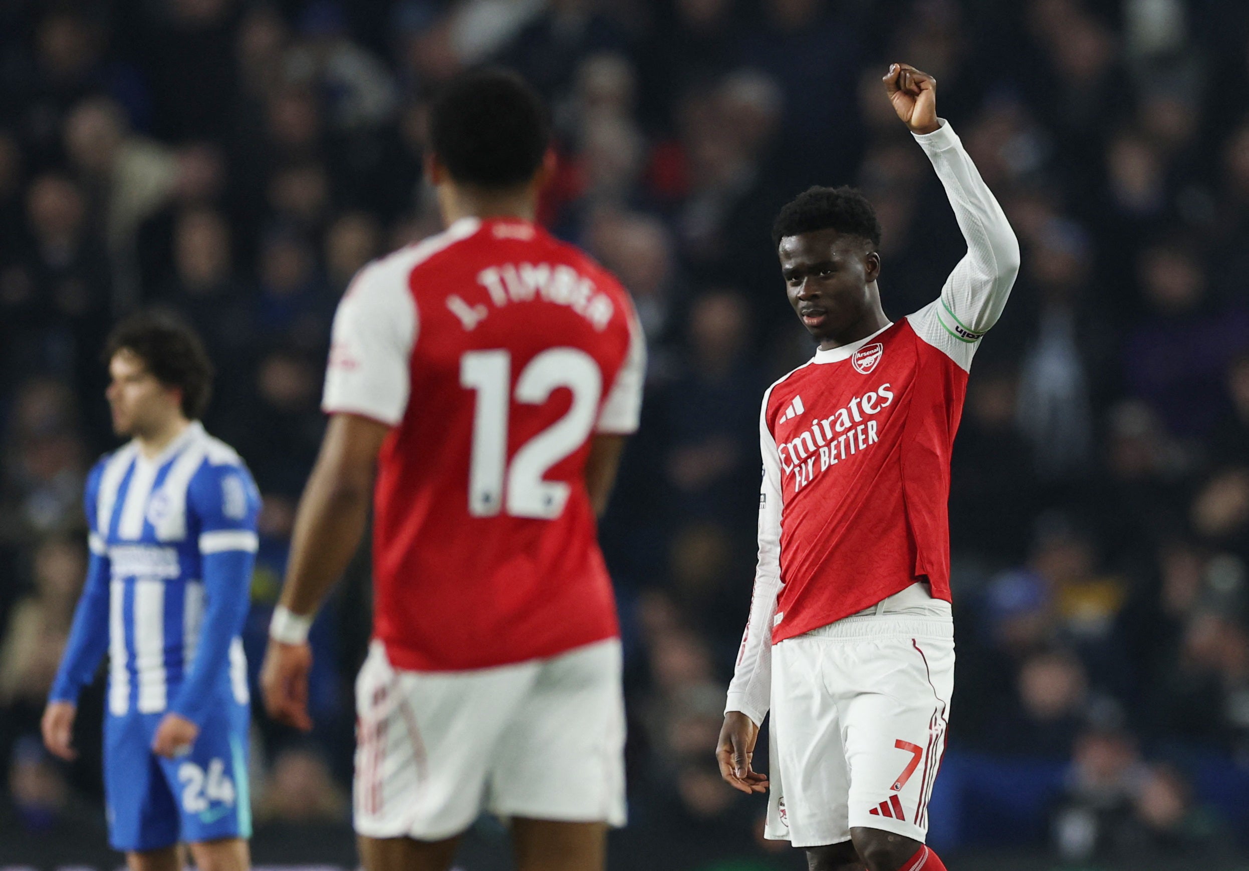 Bukayo Saka’s ninth-minute strike proved the difference, cutting in from the right before firing a deflected effort that went through the legs of Brighton stopper Bart Verbruggen.