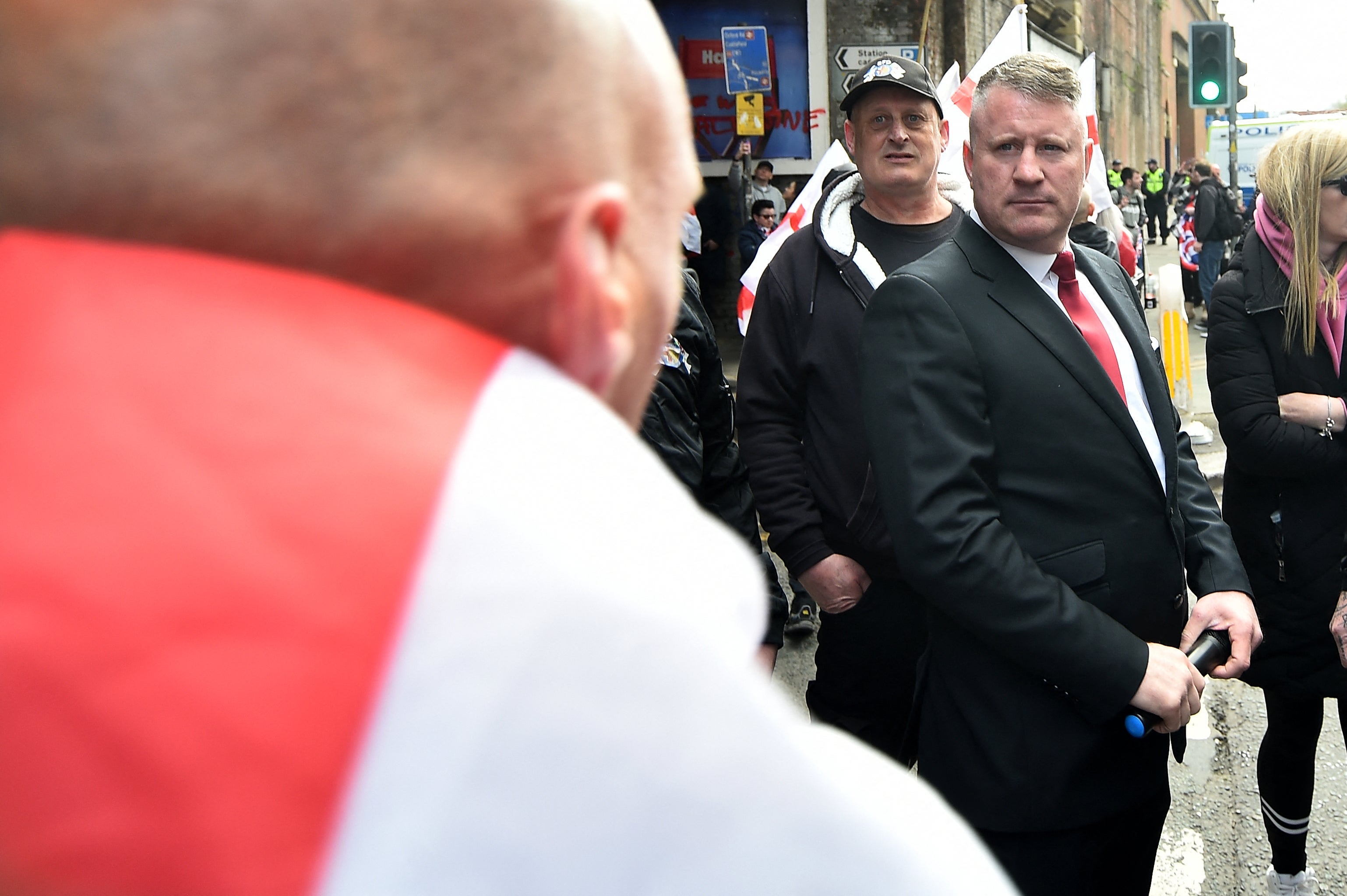 13:11 , Holly BancroftLeader of Britain First, Paul Golding, a man with a conviction for hate crime, has been pictured at the march in Manchester.