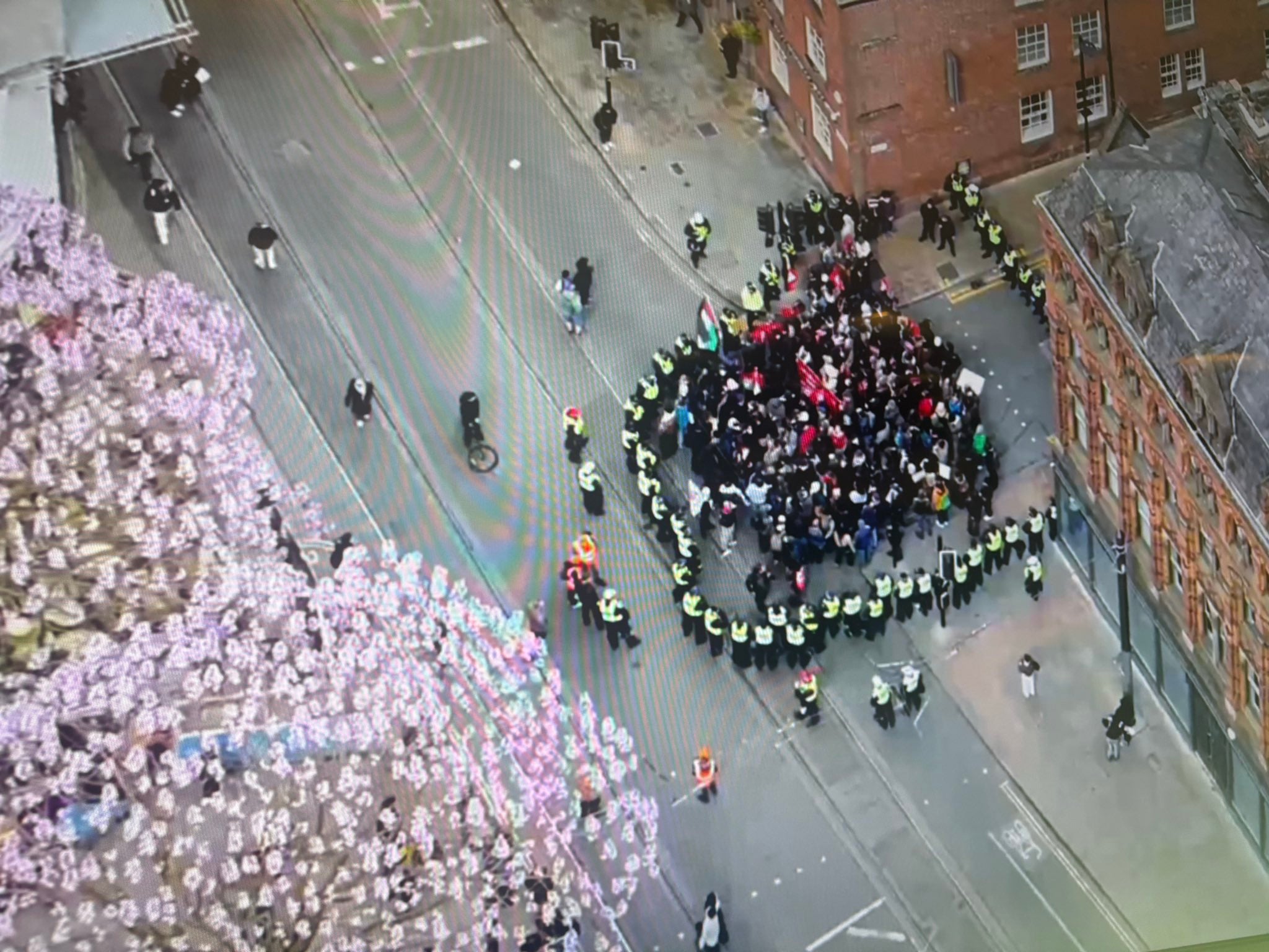 13:34 , Holly BancroftA group of counter protesters have been moved away from tram tracks to minimise travel disruption in Manchester. Greater Manchester Police have shared an aerial photo of the small group surrounded by police officers.