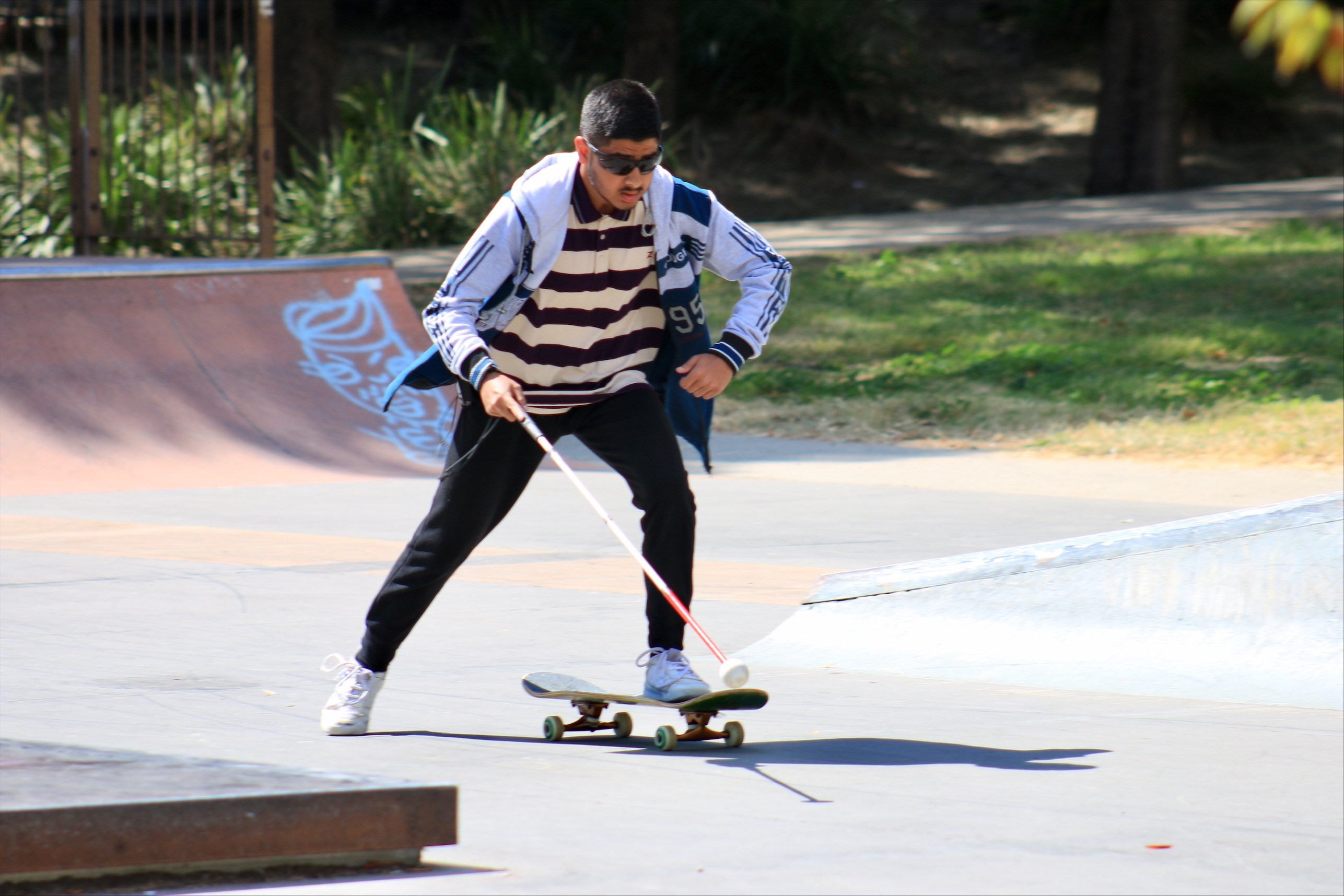 Abdul uses a cane to help him map out the ramps and edges of the skate park.