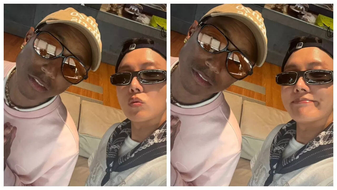 Pharrell, currently in South Korea as Louis Vuitton’s men's creative director, posed alongside j-Hope for a couple of selfies, which was captioned, "P & j. Can't wait for 2025."