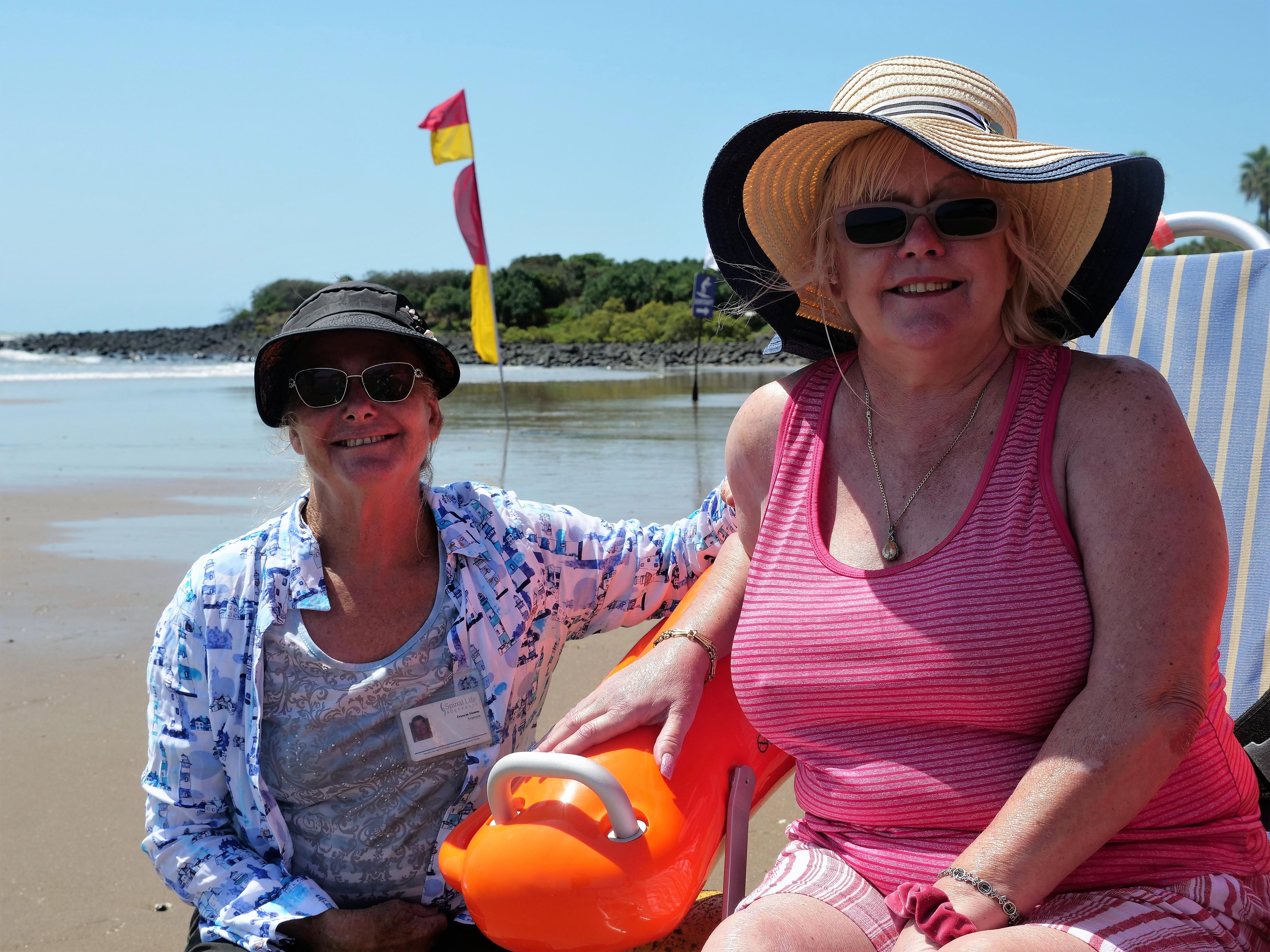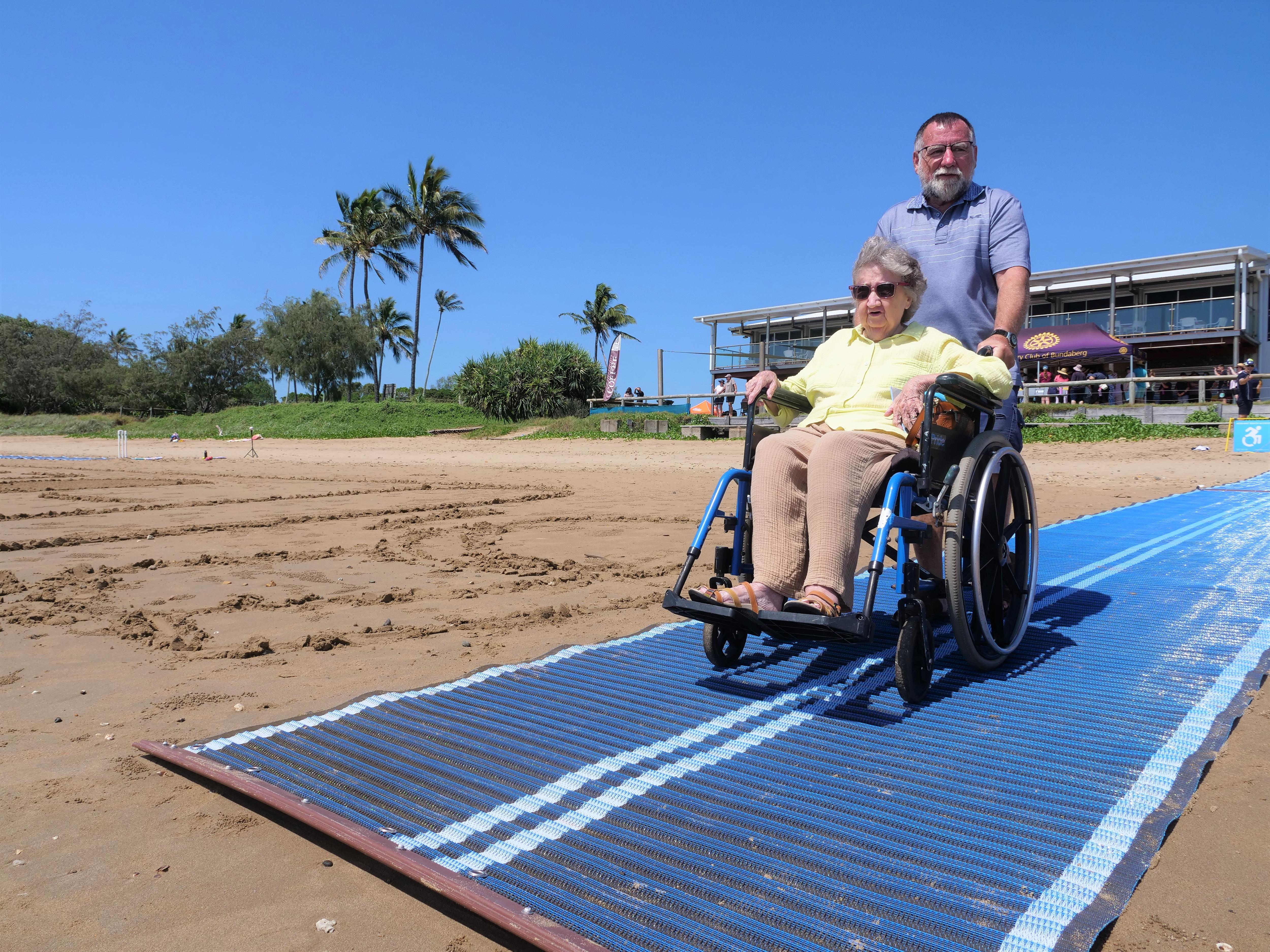 The pair were among eager beachgoers who tried out new accessible beach matting and floating wheelchairs at Bargara's Nielsen Park in Queensland's Wide Bay region.