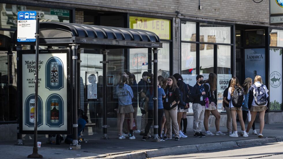 A group of students wait for a CTA bus at a stop on North Western Avenue near West Lawrence Avenue on the North Side on Wednesday. (Ashlee Rezin/Sun-Times)