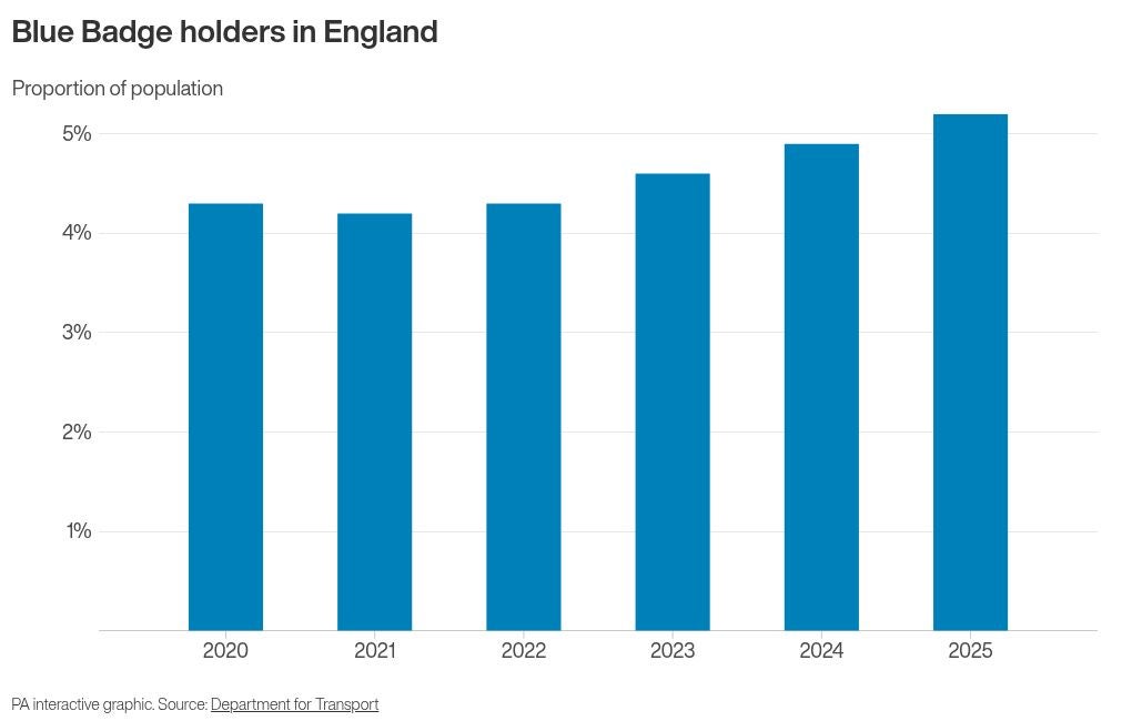 Press Association analysis of the latest Department for Transport (DfT) data found a record high 5.2% of people in England had a blue badge as of March 31 last year.