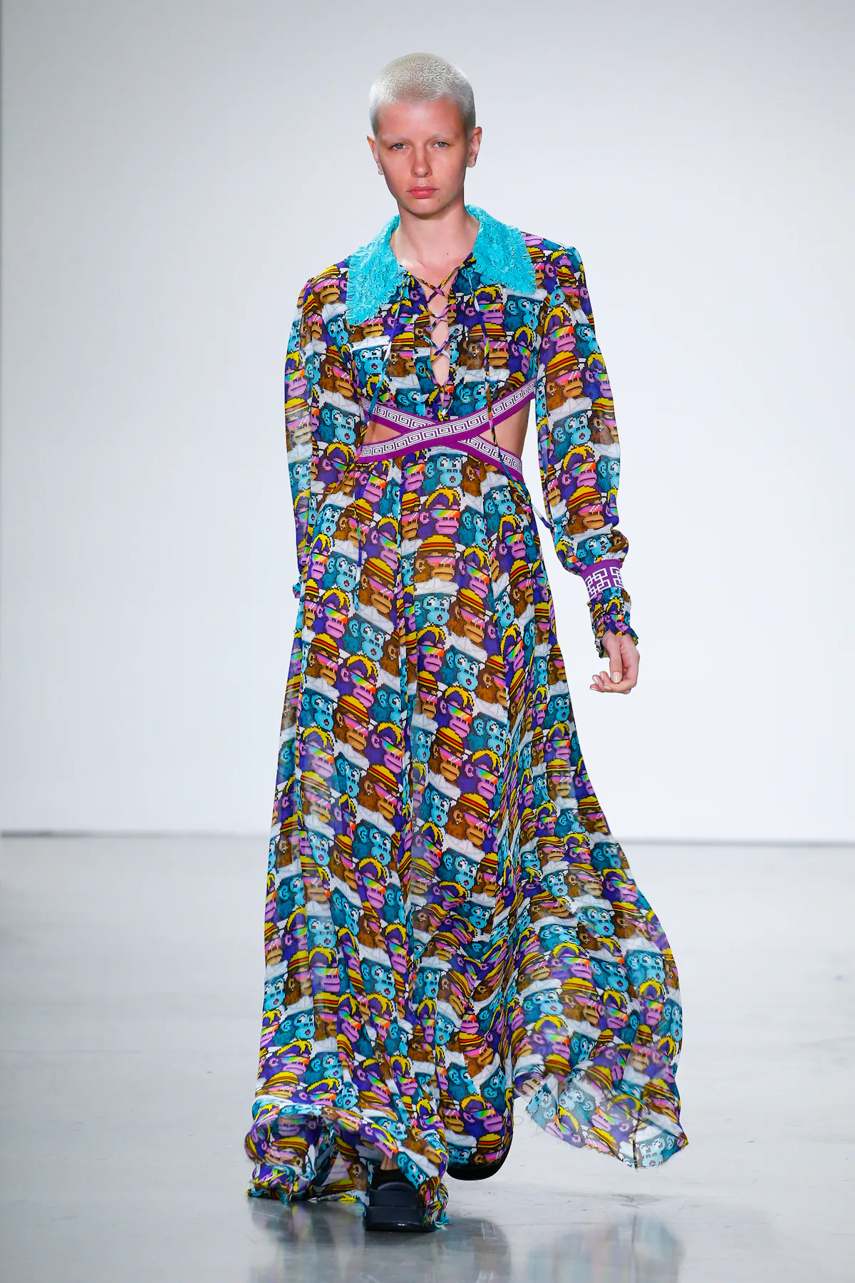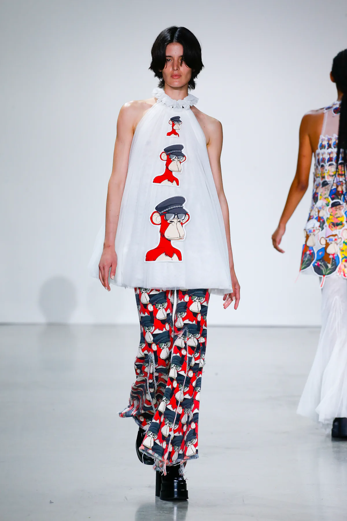 Characters from the Bored Ape Yacht Club, CryptoPunks, CyberKongz, and Awkward Astronauts appeared sewn, printed, and even embroidered on apparel and accessories. “I wanted the creators of these NFTs, and even those unfamiliar with NFTs, to be excited and to think, ‘Wow, they’re alive!’” Tam said in a press release. Her show, according to its notes, was meant to “rewire the current fashion landscape.”