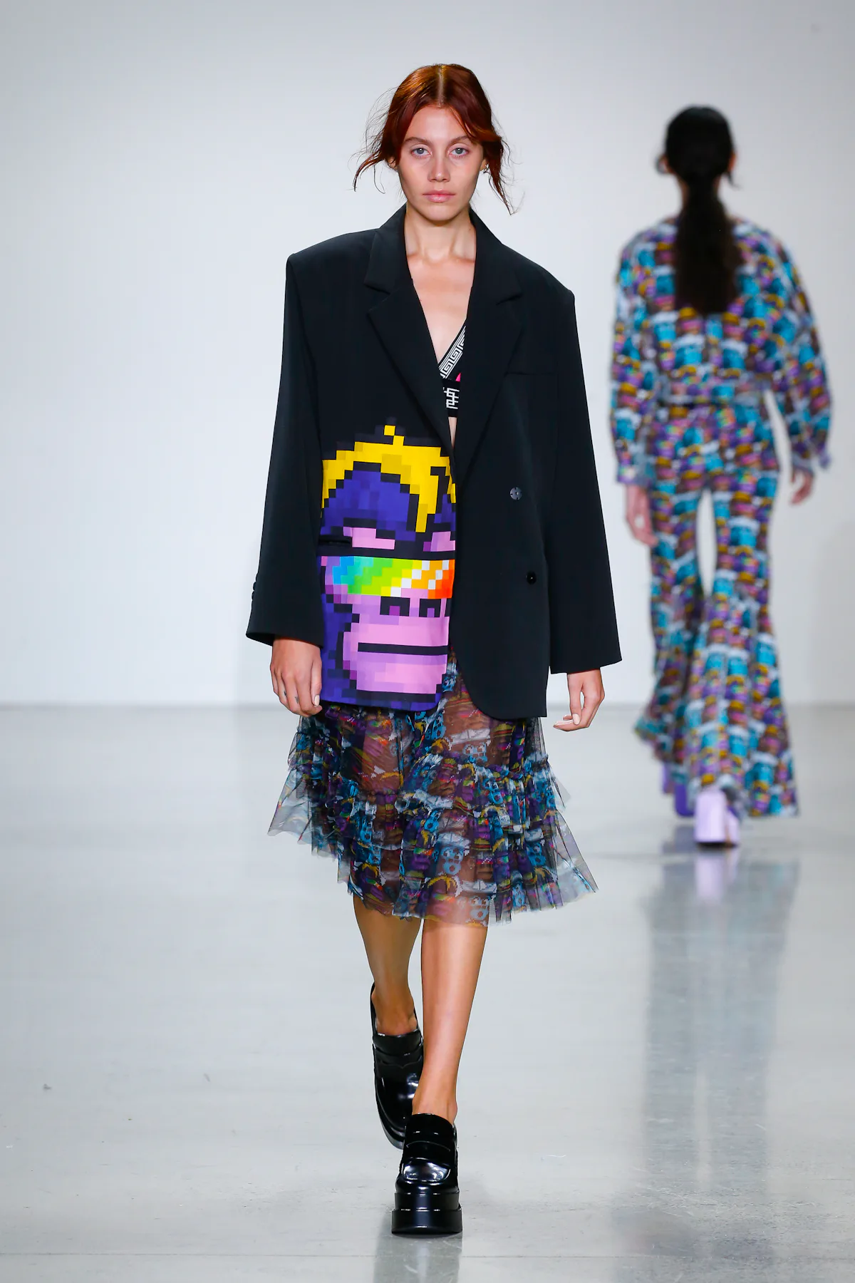 As models walked down the runway at Spring Studios, a range of pixels danced on a screen in the background. The imagery came courtesy of Scapes, a blockchain platform featuring 10,000 digital landscapes. Apes grinned on blazers; CryptoPunks dangled on earrings. Awkward Astronauts appeared on rainbow-colored dresses and tees, including the one worn by attendee Cameron Winklevoss.