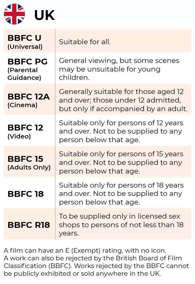 The Indian rating system currently has four rating systems - U: All ages; UA (Children of ages 7+, UA 13+ and UA 16+); A: Adults only and S: Restricted to a specific group of people.