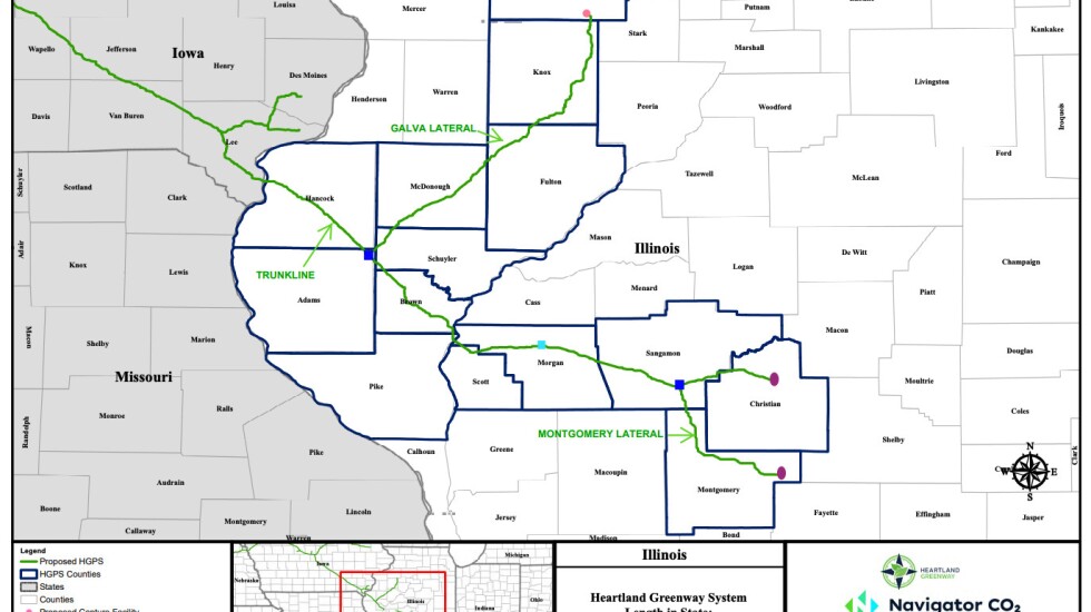 The 1,350-mile pipeline would travel through the five states, with 21 collection sites. The Illinois portion would have about 292 miles of pipeline in 13 counties, starting in Hancock County to the west and splitting north to Henry County and southeast to Montgomery County.