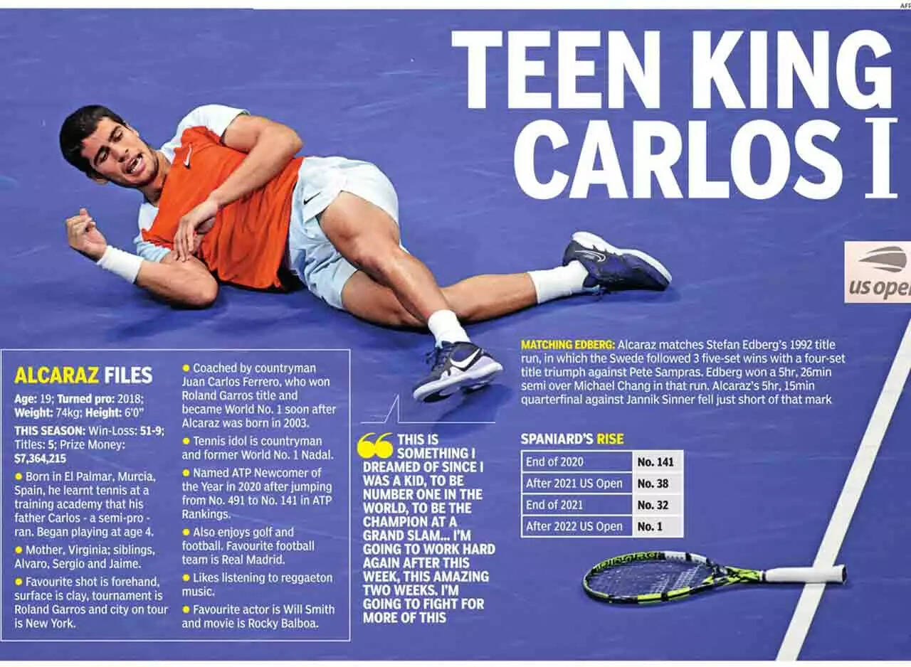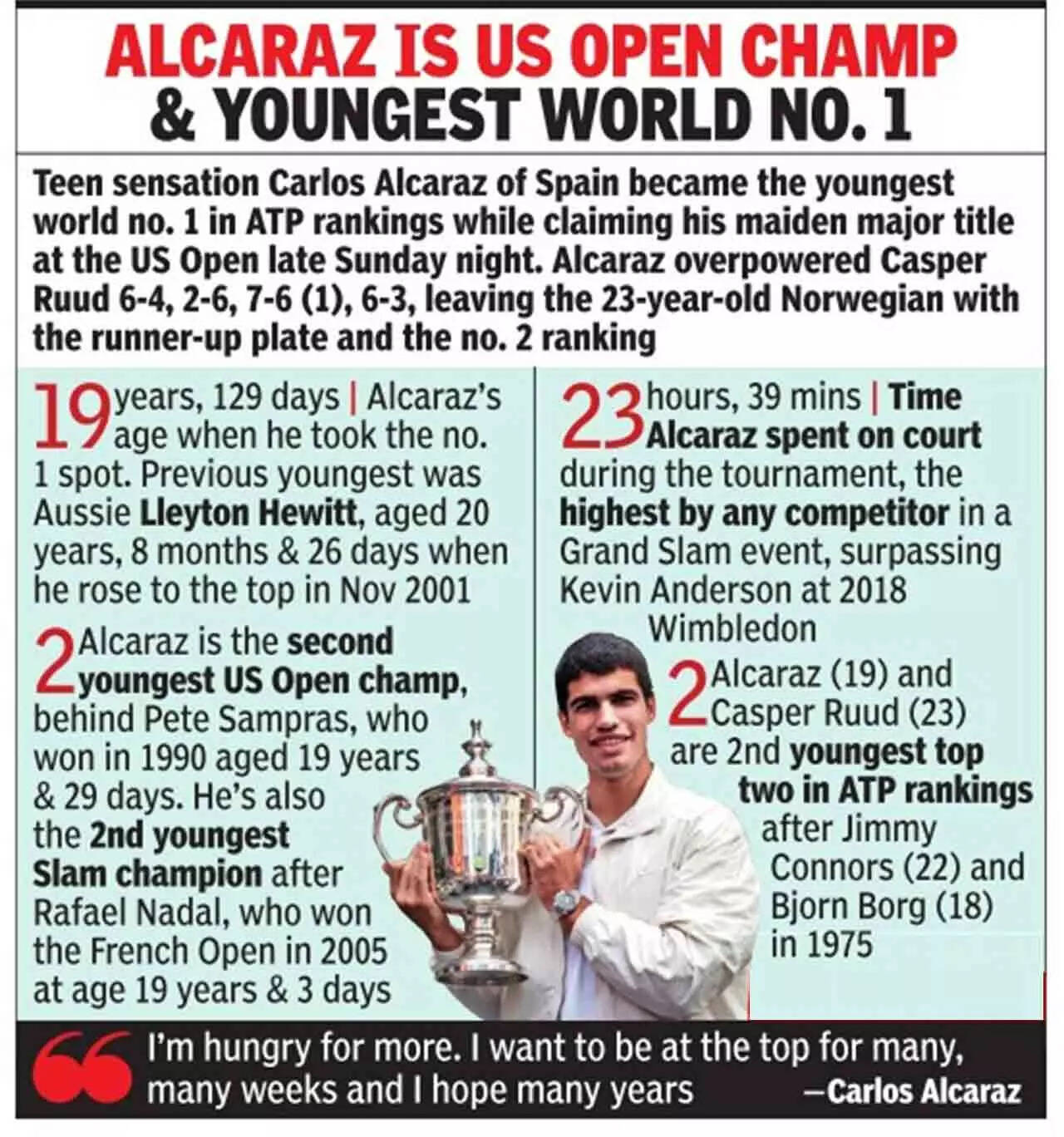 Alcaraz overpowered Casper Ruud 6-4, 2-6, 7-6 (1), 6-3 in the winner-takes-it-all final at the Arthur Ashe Stadium, leaving the 23-year-old Norwegian with the runner-up plate and the No. 2 ranking.