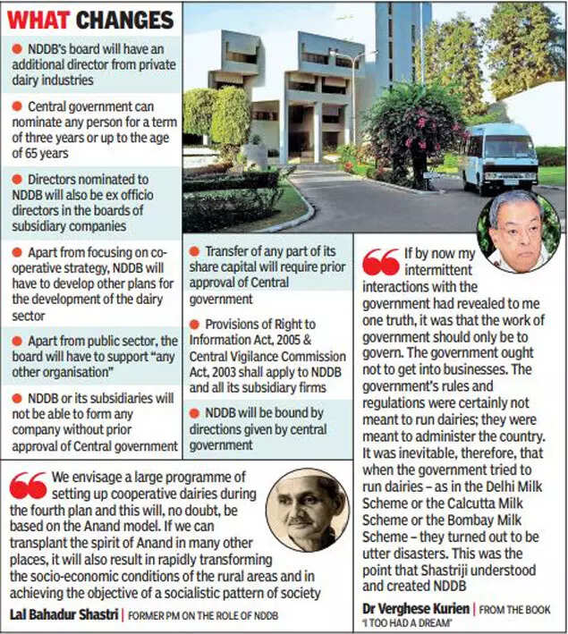 "Further, prior approvals will be required from Central government to form any company or subsidiary company," said a source close to the development. "NDDB shall be bound by such directions on questions of policy involving public interest..as the central government may give in writing to it from time to time," a para from the proposed amendment states, adding that "the decision of the central government whether a question is one of policy or not shall be final."