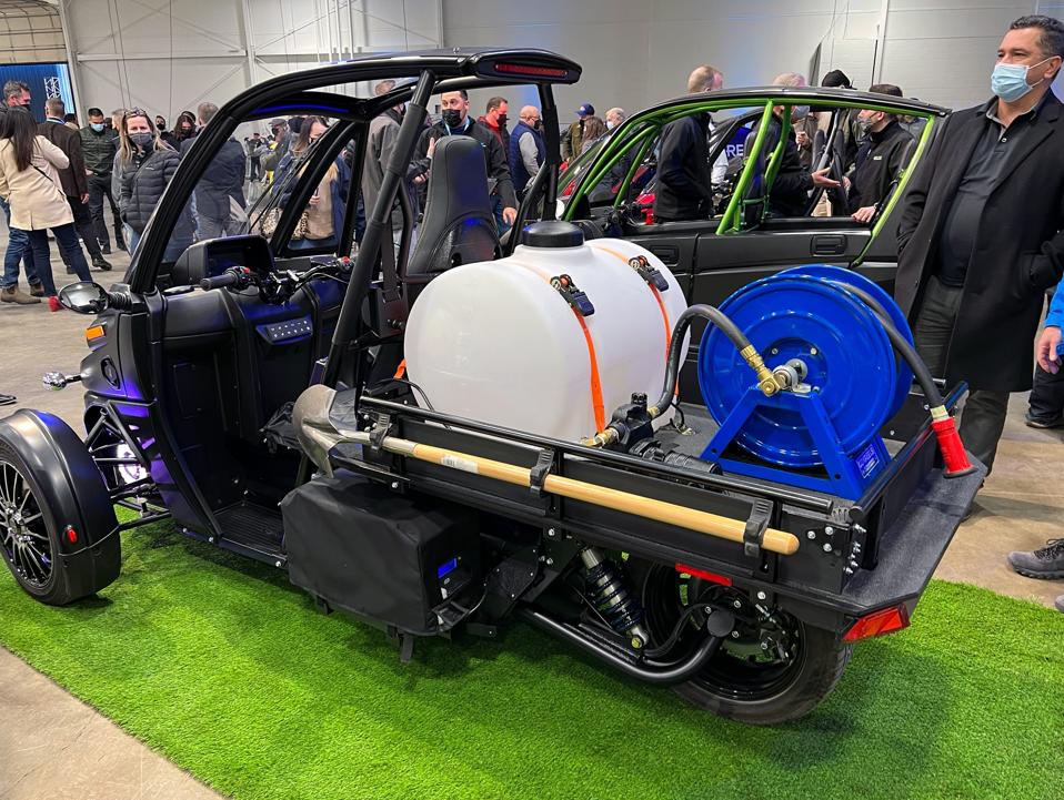 Frohnmayer reiterated his goal in starting Arcimoto: To provide an alternative to cars, even electric cars, with a smaller, leaner, less expensive electric vehicle that requires much less material to make than a car or truck, but can still be used in much the same way - and also in ways cars and trucks cannot be used. One such case (below) was an FUV outfitted with a small tank of water and a long hose that firefighters can use to quickly put out small fires - especially wildfires - extinguishing them before they spread and well before larger firetrucks can get to the location.