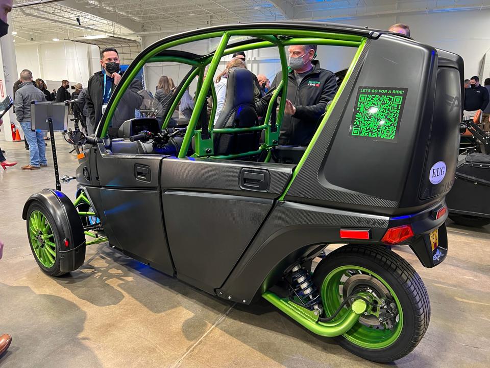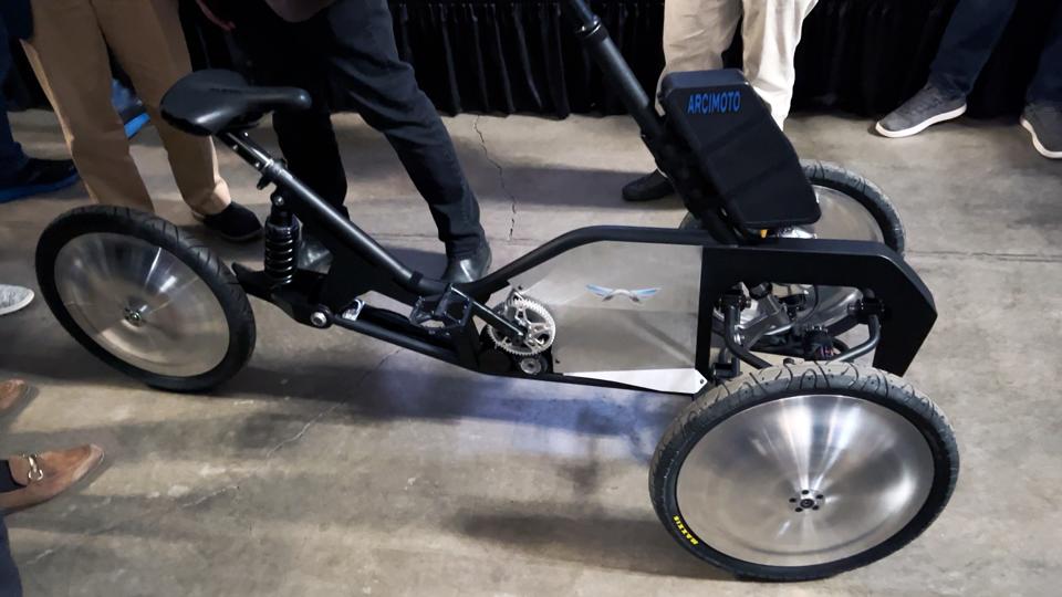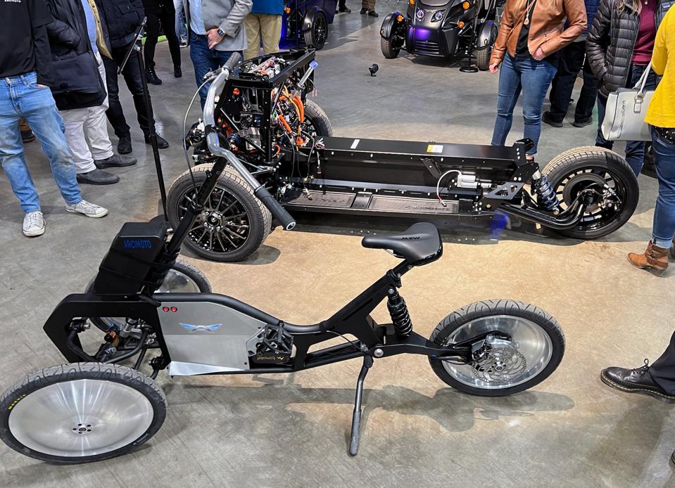 Perhaps the highlight of the presentation was the unexpected unveiling of a unique ebike Arcimoto plans to produce. Call the Mean Lean Machine or MLM, the three-wheeled ebike is unlike any ebike available today, and is the first vehicle in Arcimoto’s “Platform 2” initiative (the FUV being Platform 1). Frohnmayer said Platform 2 will focus on smaller EV platforms including ebikes, scooters, tuk-tuk type machines, small autonomous rolling delivery robots, electrified wheelchairs and mobility scooters.