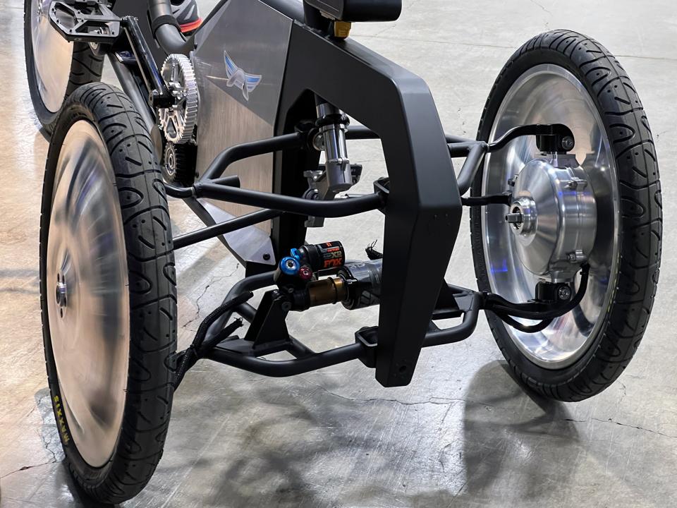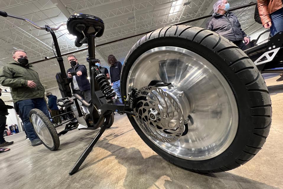 The prototype, while still clearly a prototype, appeared to be well along in development and featured full suspension, disc brakes, adjustable ergos and concealed electronics. Because it uses a motor at each wheel, there is no conventional chain drive or derailleur gears. Production versions will carry one or two people, according to Arcimoto, and have a range of over 200 miles. Frohnmayer said that unnamed “Tesla alums” helped develop the Mean Lean Machine. Going back to the materials consumption comparison and the idea of micromobility, Frohnmayer said he could build 100 MLMs from the materials used to make one Hummer EV. The Mean Lean Machine should be available in Q4 this year and is now available for preorder with a $100 deposit, although no final price has been announced. Frohnmayer said more information is forthcoming including accessories for using the MLM for delivery duties and rental.