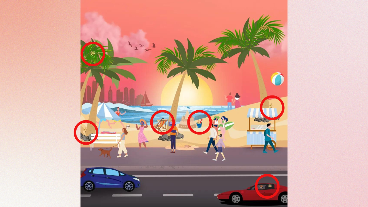 Take a good look at the palm trees swaying gently in the breeze. Nestled at the top of one of these trees is the first hidden money bag. Can you see it?Scan the bases of the palm trees carefully. Two more money bags are sitting quietly here, blending in with the surroundings. Have you spotted them yet?Turn your attention to the beachgoers. One relaxed individual is lounging and gazing out towards the water. Right next to them is the fourth money bag. Did you catch it?Near a sandcastle being meticulously built, the fifth money bag is tucked away. Take a close look at the scene. Can you find it?For the last money bag, look towards the vehicles parked by the beach. One of the cars has a money bag sitting in the backseat. Can you see it peeking out?