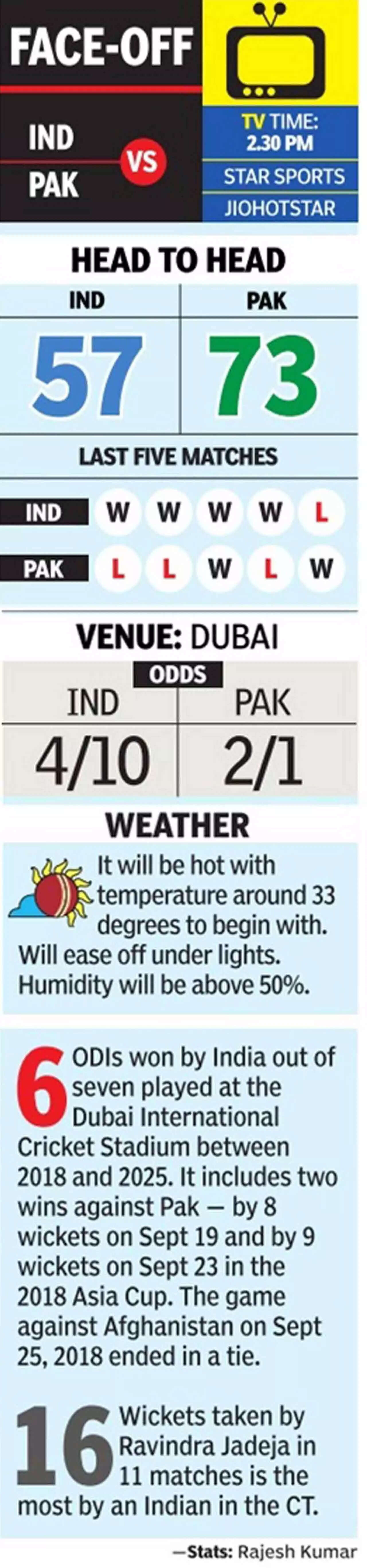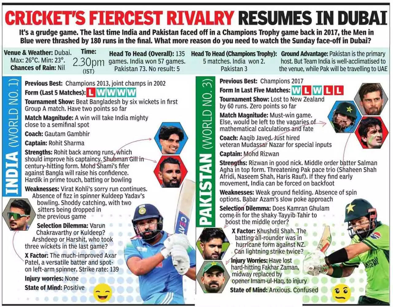 DUBAI: Eight months after India pipped Pakistan in a thrilling, low-scoring group match of the T20 World Cup on a difficult pitch in New York, cricket's most storied but, of late more of over-hyped rivalry will present its latest installment when a red-hot India, eyeing a semifinal berth, play Pakistan, struggling for survival in their first ICC tournament as hosts in 29 years, on Sunday night at the Dubai International Cricket Stadium in game five of the 2025 Champions Trophy.