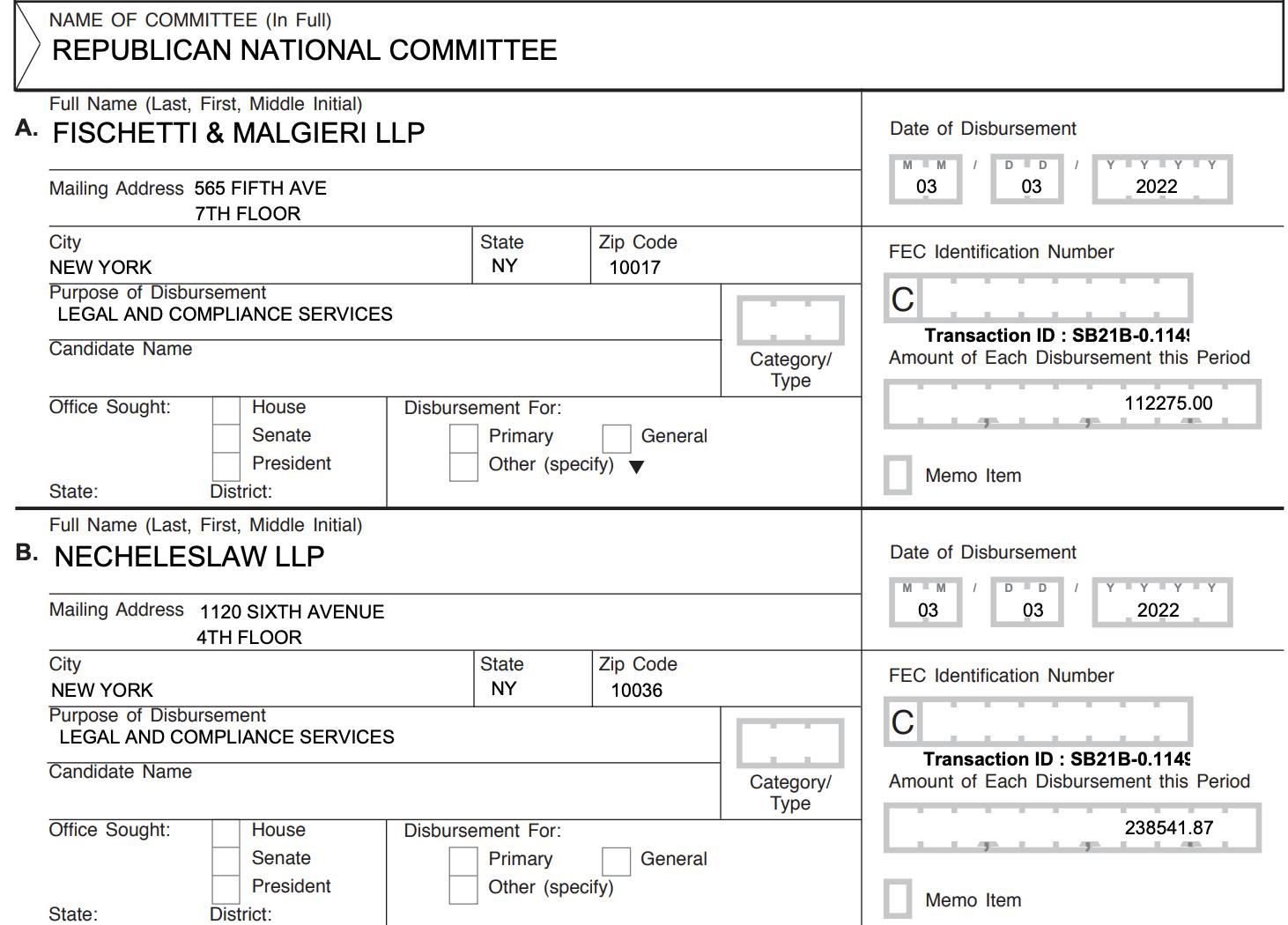Attorneys Susan Necheles and Ronald Fischetti represent Trump in the Manhattan district attorney’s probe into his business practices. On March 3, the RNC paid Necheles’s firm $239,000 while Fischetti’s firm received $112,000 for “legal and compliance services.”