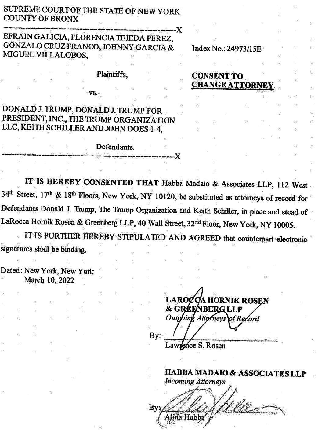 Last month, Trump replaced his attorneys in a suit filed by protestors of Mexican origin claiming that the Trump Organization's security attacked them in front of Trump Tower. Now representing Trump is Alina Habba, an attorney based near one of Trump’s New Jersey golf clubs who is now working for him in at least seven of the investigations and lawsuits. Lawrence Rosen, the attorney Habba is replacing, also has served on Trump's legal team in the New York attorney general’s investigation.