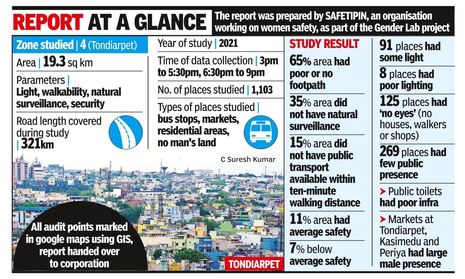 CHENNAI: About 65 % of the corporation’s Tondiarpet zone in North Chennai has no walking space, while 35% has poor natural surveillance, an audit report by an organisation working on women safety studies has found.