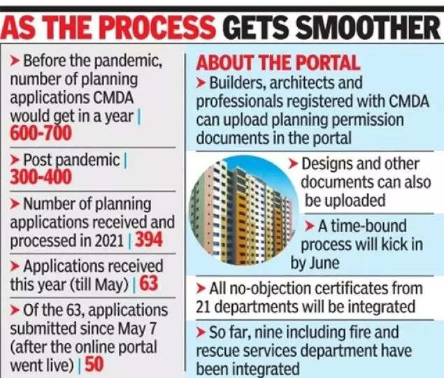 CHENNAI: Building approval applications to the CMDA, which had reduced during the pandemic and continued this year too, saw an increase after the Chennai Metropolitan Development Authority’s online portal went live from May 7.