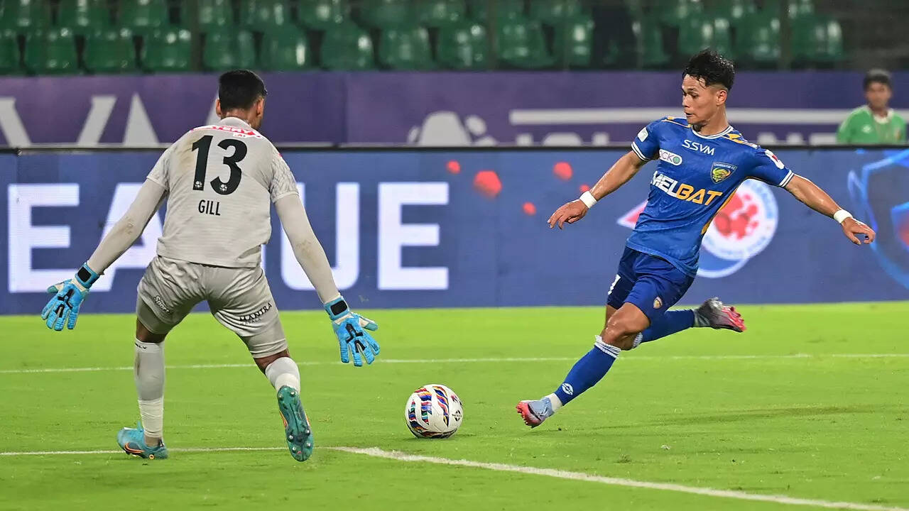 The visitors took the lead with a big slice of luck as Ayush diverted PV Vishnu’s cross into his own net. Vishnu got on the end of a long ball from his keeper Prabhsukhan Singh Gill and kept his composure to fire the ball across the face of the goal from the left. A sprinting Ayush attempted to thwart the danger but instead hit it straight into his own net with his right shin.