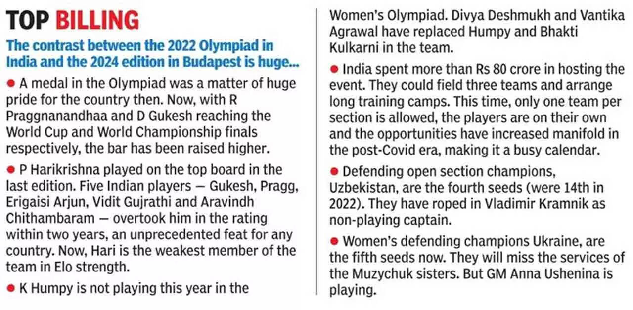Srinath has a point. Among the top-8 players playing in the Olympiad, three are Indian (Gukesh Elo 2764, Arjun 2778 and Pragg 2750). There was no Indian in the top-8 last time. That raises the expectations manifold. "Any medal would have been cherished last time," said 30-year-old GM Srinath. "But with the kind of team we have now, anything less than gold will be viewed differently.