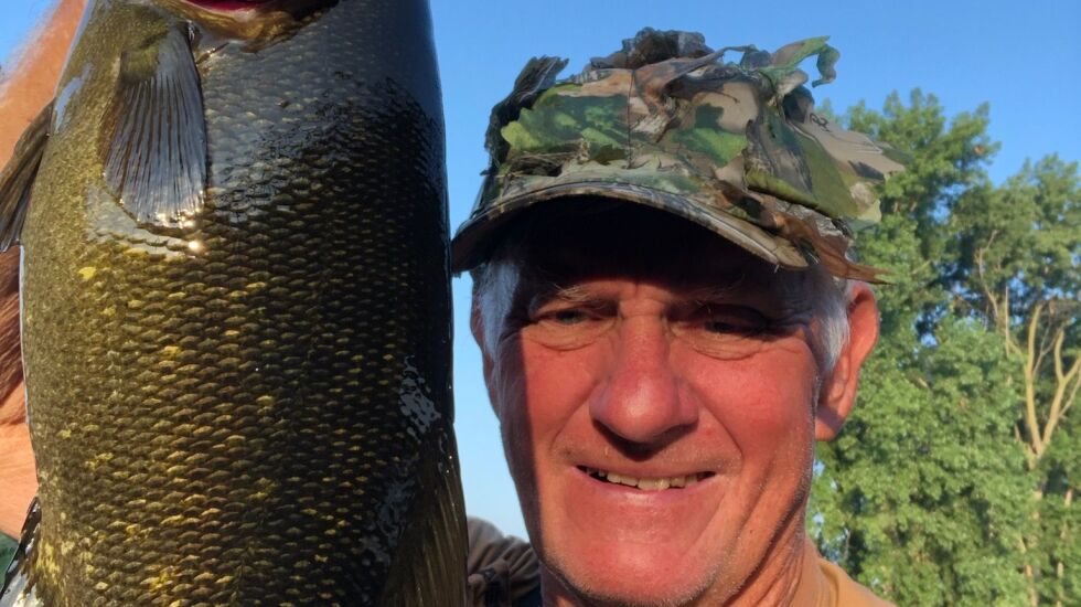 Dale, hit the big lake Friday July 22. Took me a few hours to get somewhat dialed in on the smallies. Unlike years past at this time of year, the smallmouth were far off the rap. I managed about 15 with the largest only at 3.2lbs. Hmmmm, size was not there and one of my smallies was only 2.5lbs and almost 18 inches. Most were skinny guys and gals telling me, they came off spawn not long ago. Last year at this time, 18 inches were solid 3.5lbs or better. If my theory is true, the next few weeks should be real good as these bronze backs will certainly be on the feed. Water temps hovered around 72 and drop shots with a 4 inch senkos with green/purple was best bait but did manage 1 on a green tube. Here is a photo of the 2.5lb and it is long and skinny as shown. Lastly, I was sporting the Ken Husker O’Malley look!