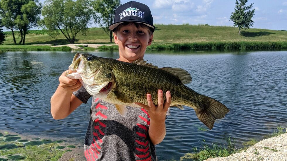 Declan Walker (age 11) fishing at a private pond with his family [caught] his PB big bass.