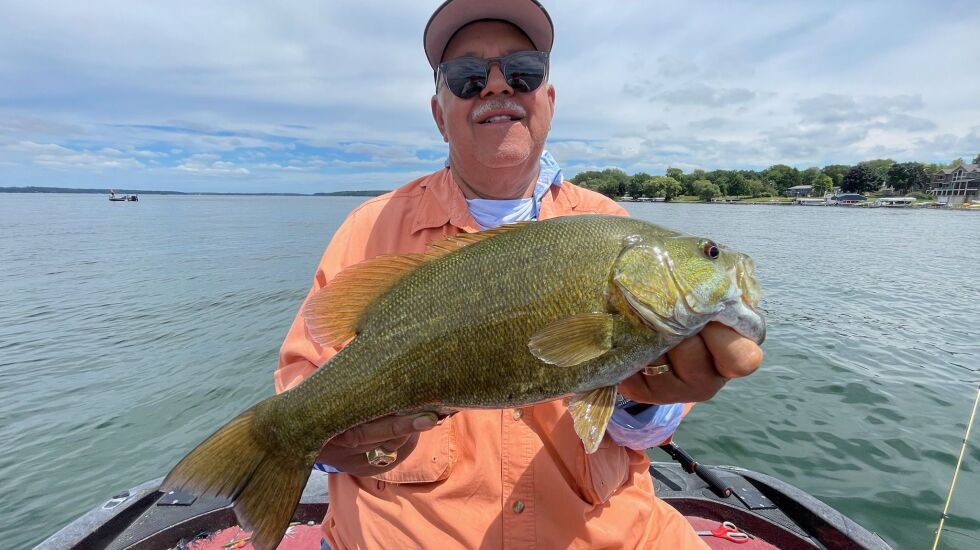 Arden Katz said that on the North side in 15-18 feet with drop-shots is good for both largemouth and smallmouth; in Geneva Bay, pumpkinseeds and bluegill are in 14-16, best on two jigs and spikes with a weight on the bottom.