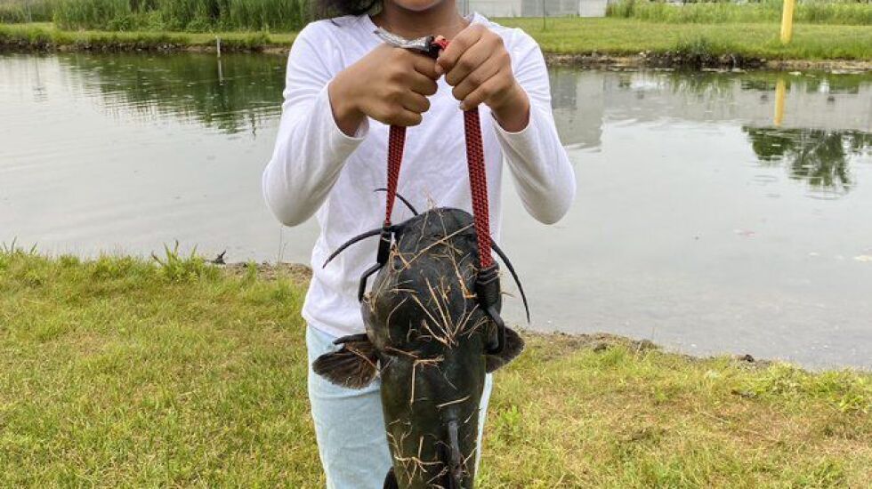 my daughter Genesis Gibbs 10 years old missed the free fishing weekend but made up for it today and caught her first flathead catfish 8lbs 24 inches, she wants to enter it into the fish of the week. She was scared to touch it a first but she managed.