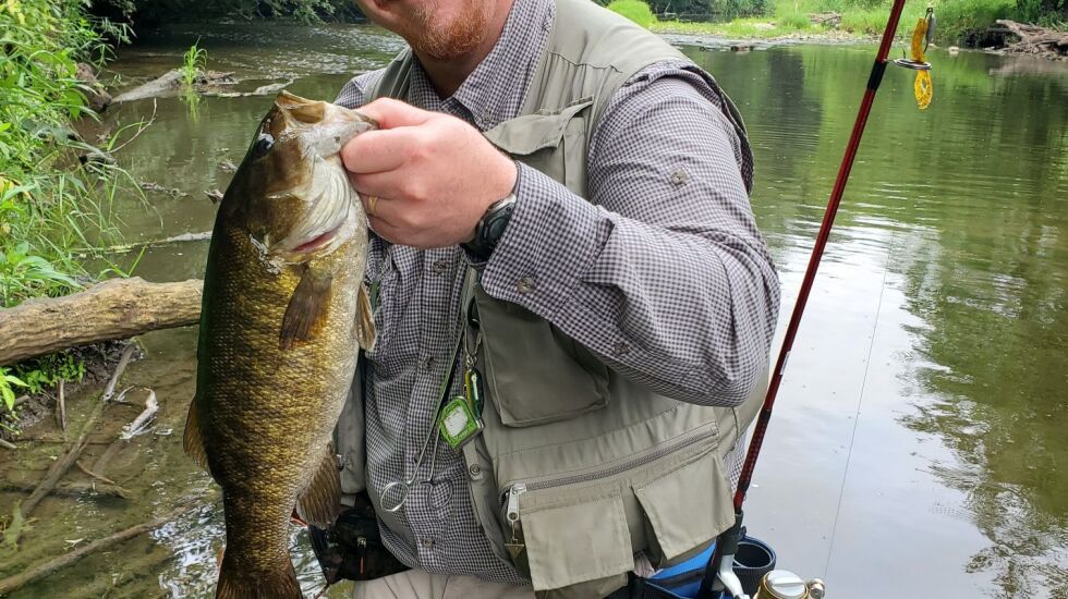 Fish of the day, a 12 1/2 rock bass they don’t get much bigger. Hit a # 2 mepps spinner. G. Peters