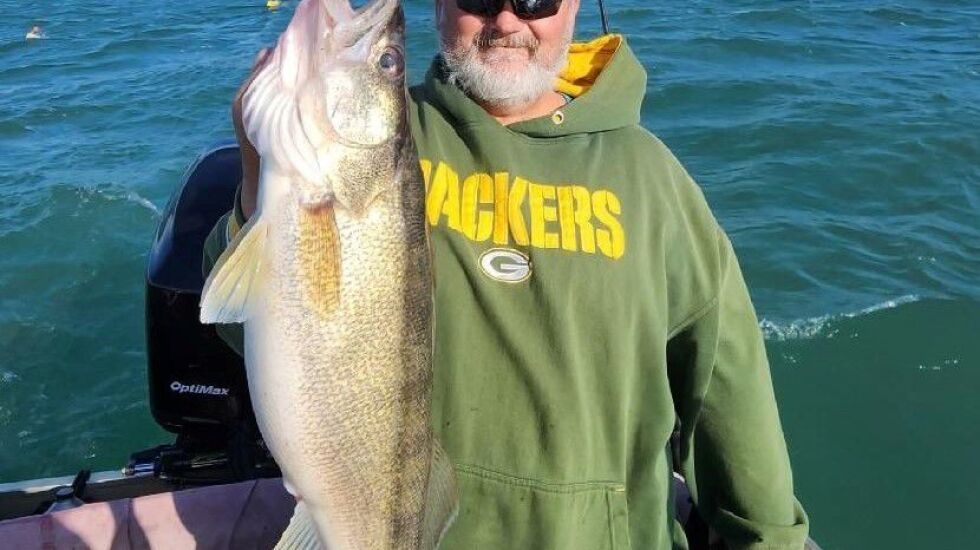 Shaun Murphy messaged the photo at the top from his boat Friday near Kelleys Island on Lake Erie of Jerry Shear and a big walleye, and this: