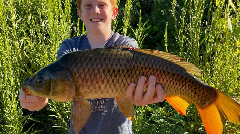My grandson, Colin, holds the fish my son, Rob Pendergast, caught, using bread, at Salt Creek in Oak Brook.