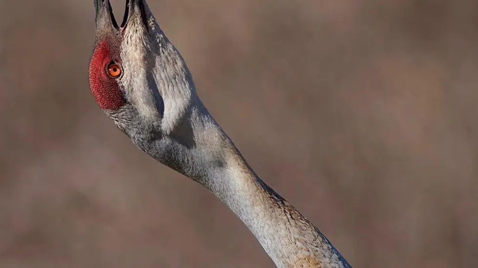 Emil Baumbach photographed this sandhill crane “bugling in a territorial display at another sandhill crane pair that was flying overhead” in Lake Forest.” He added, “Their bugling sound can be heard for 2.5 miles. Sandhill cranes have returned to our area and will be nesting soon.”