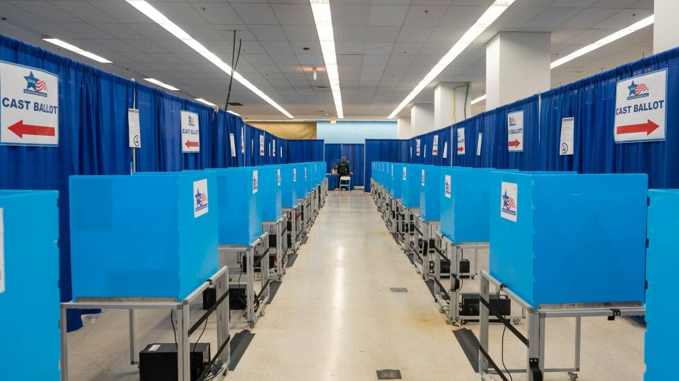 A row of voting booths sits empty April 3, the final day of early voting for Chicago’s mayoral runoff at the downtown voting supersite. (Tyler Pasciak LaRiviere/Sun-Times)