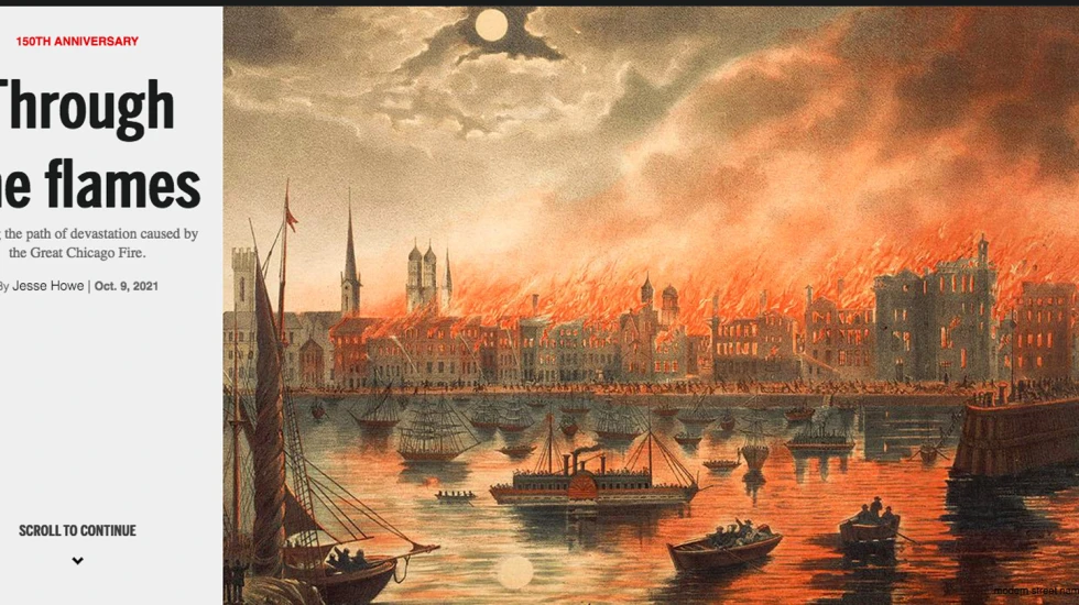 • Jesse Howe, whose interactive illustration “Through the flames,” examining the spread of the Great Chicago Fire and its aftermath, won first-place honors in three categories, for best illustration among all media, best design / digital and best use of digital technology or data visualization.