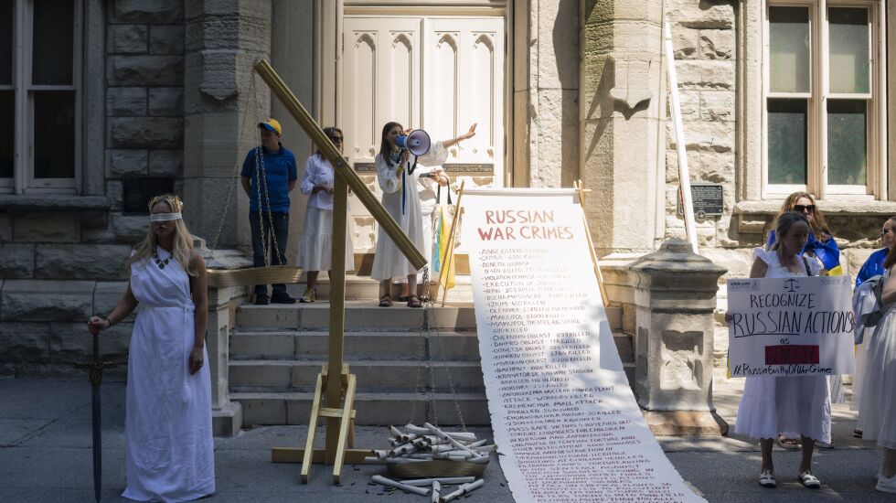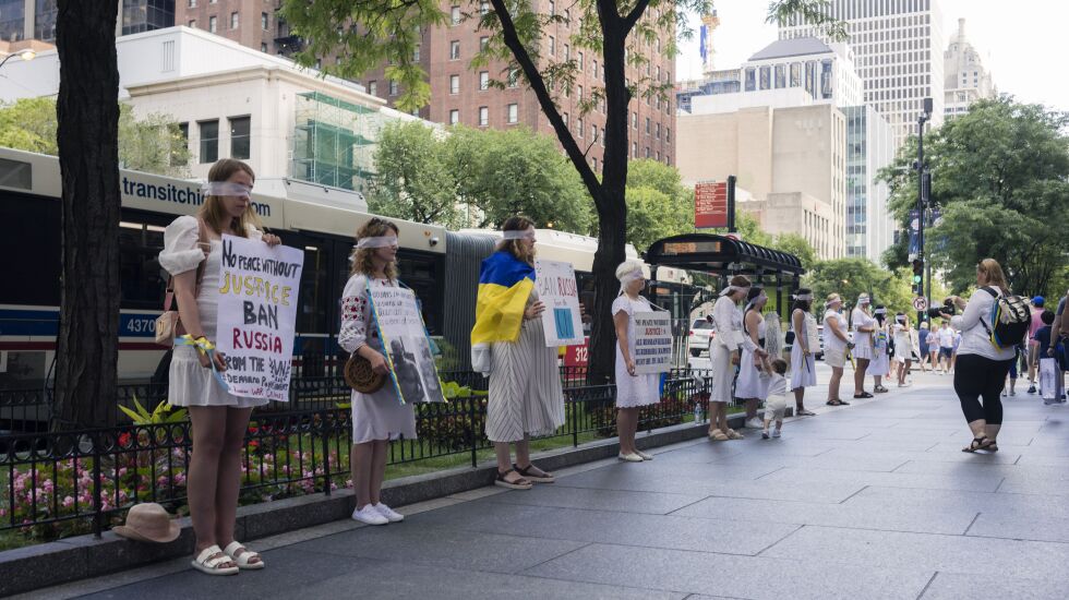 The group of more than 200 held a rally at the historic Water Tower on Michigan Avenue, where they staged an art piece that symbolized their message. The blindfolded protesters wore white. They stood next to an oversized scale and a scroll listing Russia’s crimes.