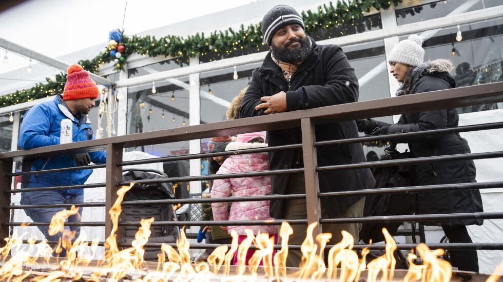 Pryank Srivastava keeps warm in front of a fire pit during Wintrust Winterland. (Pat Nabong/Sun-Times)