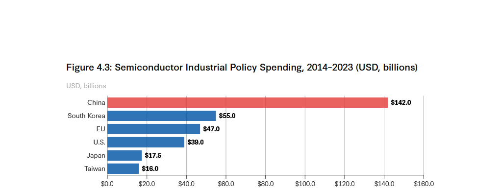 The comparison covers direct industrial policy support across the full semiconductor value chain. South Korea placed second at $55 billion, followed by the EU at $47 billion, Japan at $17.5 billion, and Taiwan at $16 billion. However, the report’s 2014 to 2023 window predates most disbursements from the U.S. CHIPS and Science Act, which was signed into law in August 2022, and it doesn’t capture the third phase of China's Integrated Circuit Industry Investment Fund (‘Big Fund III’), launched in May 2024 at roughly $47.5 billion.