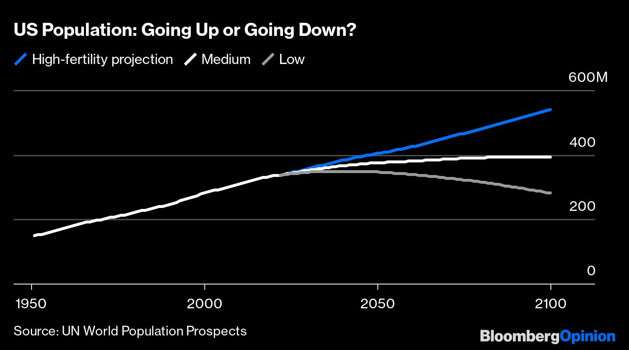 In the latest edition of its World Population Prospects, the United Nations Department of Economic Affairs offers various possible scenarios for countries’ populations. In the case of the US, both the low-fertility projection and the zero-migration projection see a decline in population by the end of the century of around 16%, from the current 336.5 million to around 280 million. But that is not the UN’s base case. In its medium-fertility variant, the US population rises 17% to 394 million by 2100. In a high-fertility scenario, it rises to 541 million.