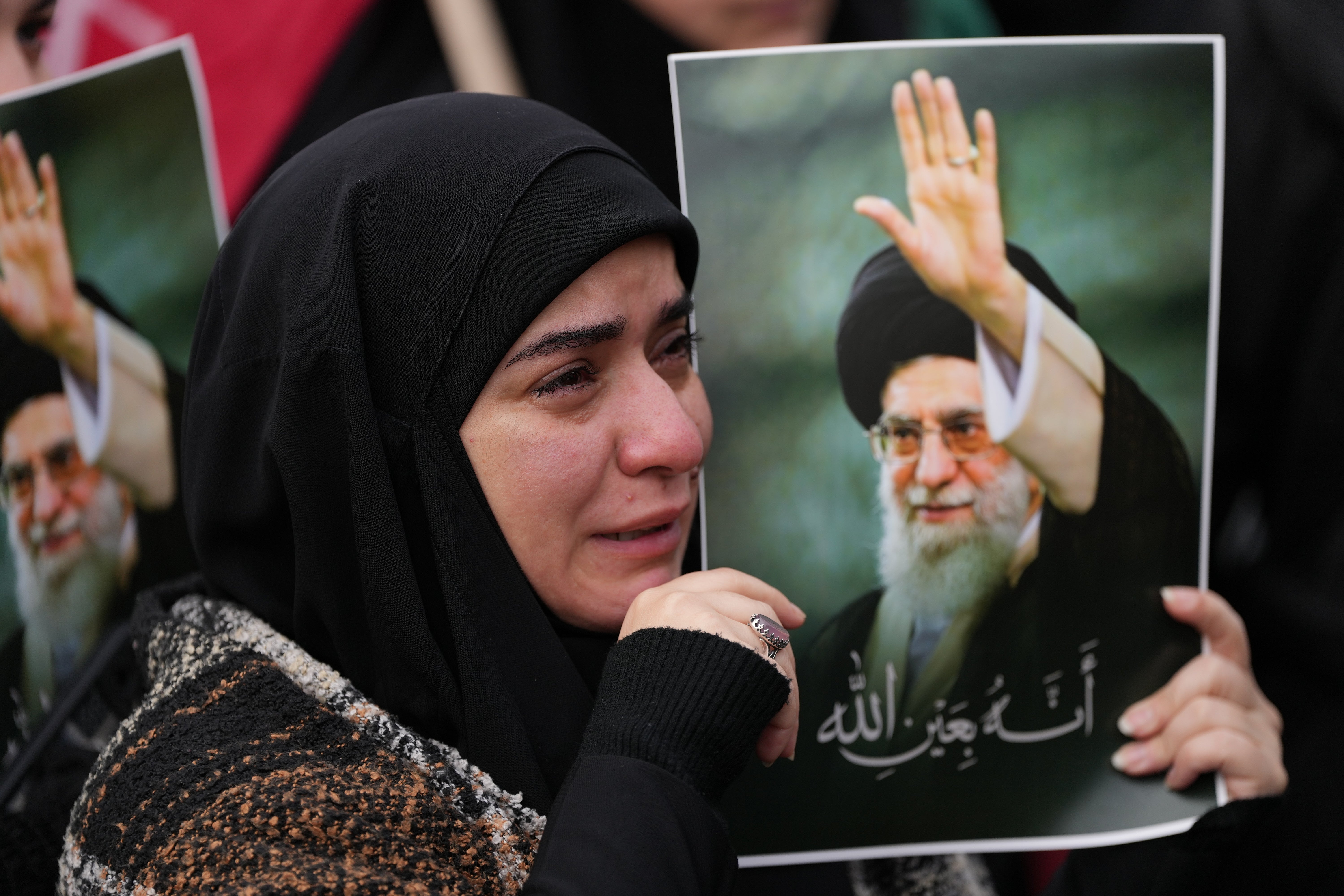 A woman cries as she mourns the assassination of Iranian supreme leader Ayatollah Ali Khamenei in Beirut, Lebanon (AP)