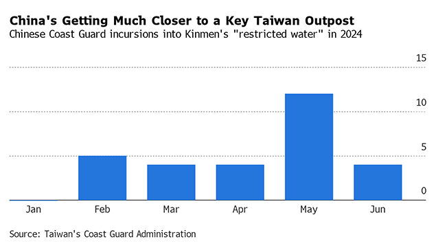 But Taiwan counted five incursions into Kinmen’s “restricted waters” in February and a similar number in each of the next two months. Then the number jumped to 12 in May — Lai’s first month leading the archipelago of 23 million people.