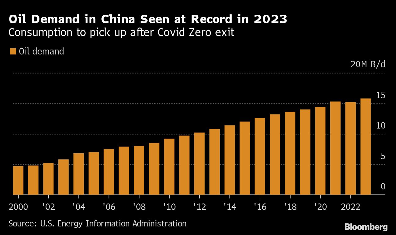 Daily demand — which contracted last year — will climb by 800,000 barrels a day in 2023, according to the median estimate of 11 China-focused consultants surveyed by Bloomberg News. That would take consumption to an all-time high of about 16 million barrels a day, the survey showed.