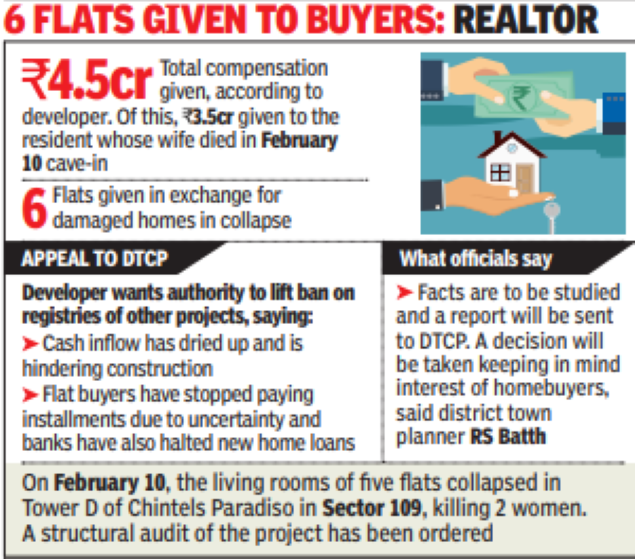 Chintels India, the developer, claimed to have paid a compensation of Rs 4.5 crore to the affected families and provided alternative accommodations to them. Of the Rs 4.5 crore, Chintels said it had given Rs 3.5 crore to Arun Kumar Srivastava, the owner of D-103 flat whose wife died in the cave-in and who himself was rescued after nightlong efforts. The owners of six flats in Tower D, whose living rooms collapsed that day, were given other flats in the same project and Chintels Serenity, the builder said.